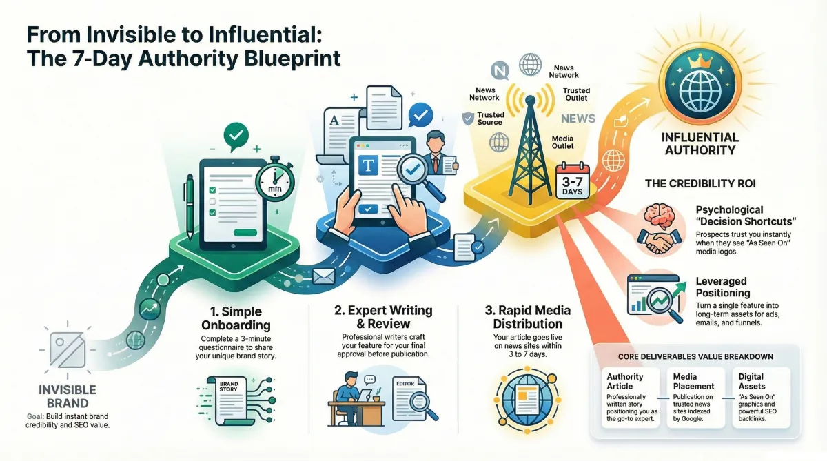 Your article typically goes live within 3–7 business days, and you’ll get the "As Seen On" logos to use anywhere.